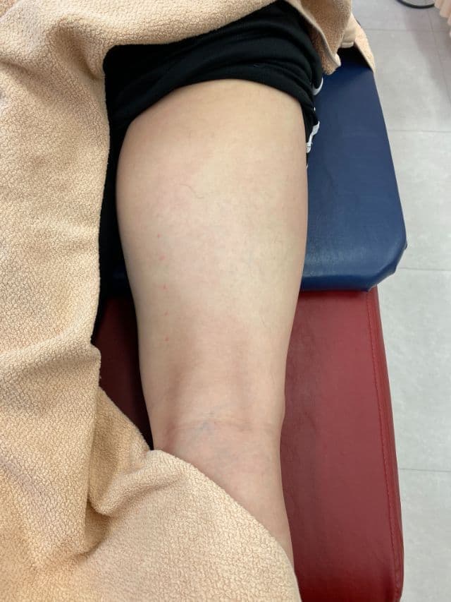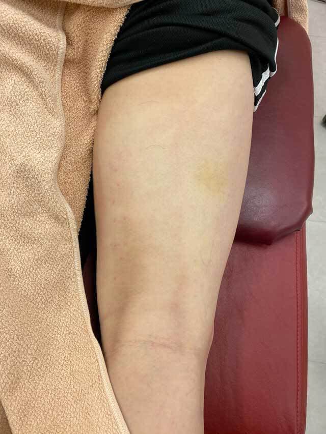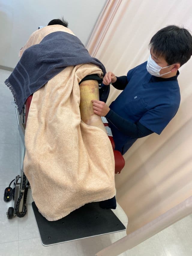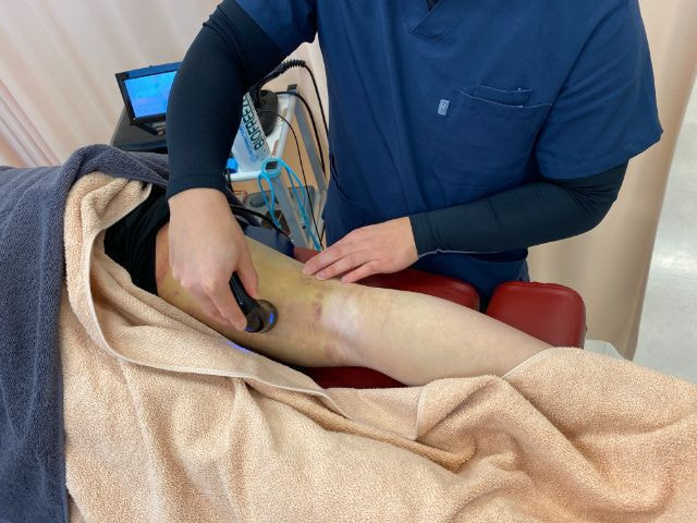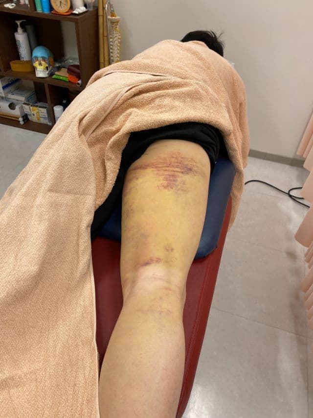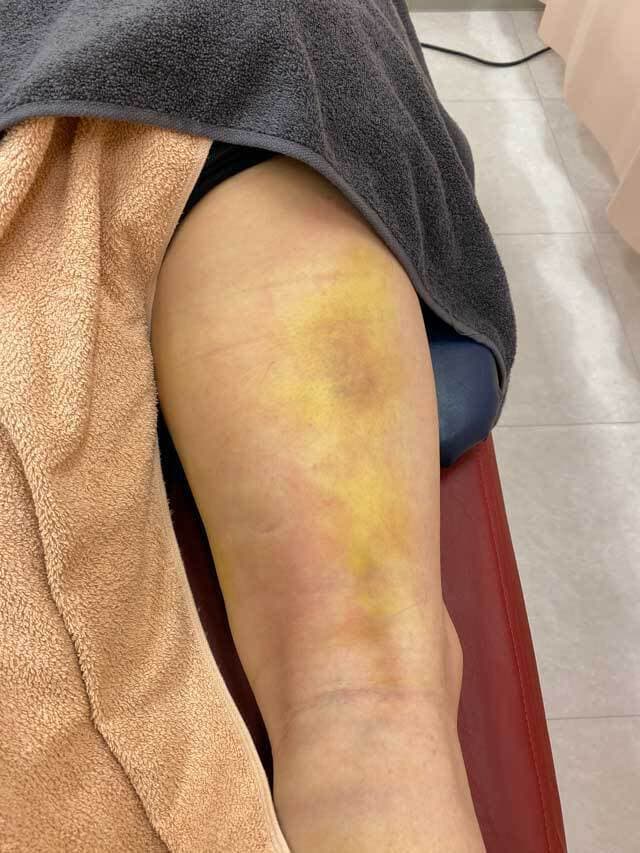 筋肉組織内に濁った血(血腫)が滞留しているので鍼治療と高周波による筋肉の循環改善をしなければなりません